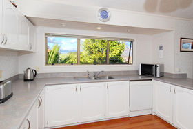 As you step inside this elevated sun drenched home, space, quality and comfort is what you experience throughout. The wide entrance way leads you to a big lounge with a high pitched solid rimu sarked ceiling. A woodburner (with wetback) in the corner provides ambience and warmth, however for your convenience a heat pump has been installed for heating on winter nights or cooling on summer nights. The lounge has a wrap around sunroom which traps all day heat and has attractive tree top views. The open plan kitchen and dining area with lovely views flows seamlessly off the lounge making entertaining easy and enjoyable. Step outside to a large paved stylish entertaining area for those long hot summer evenings. This is just part of the fully fenced 674m2 section which also provides a safe sanctuary for children and pets.