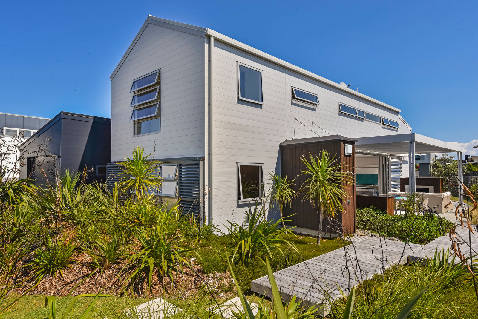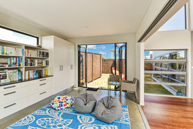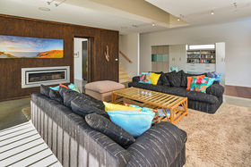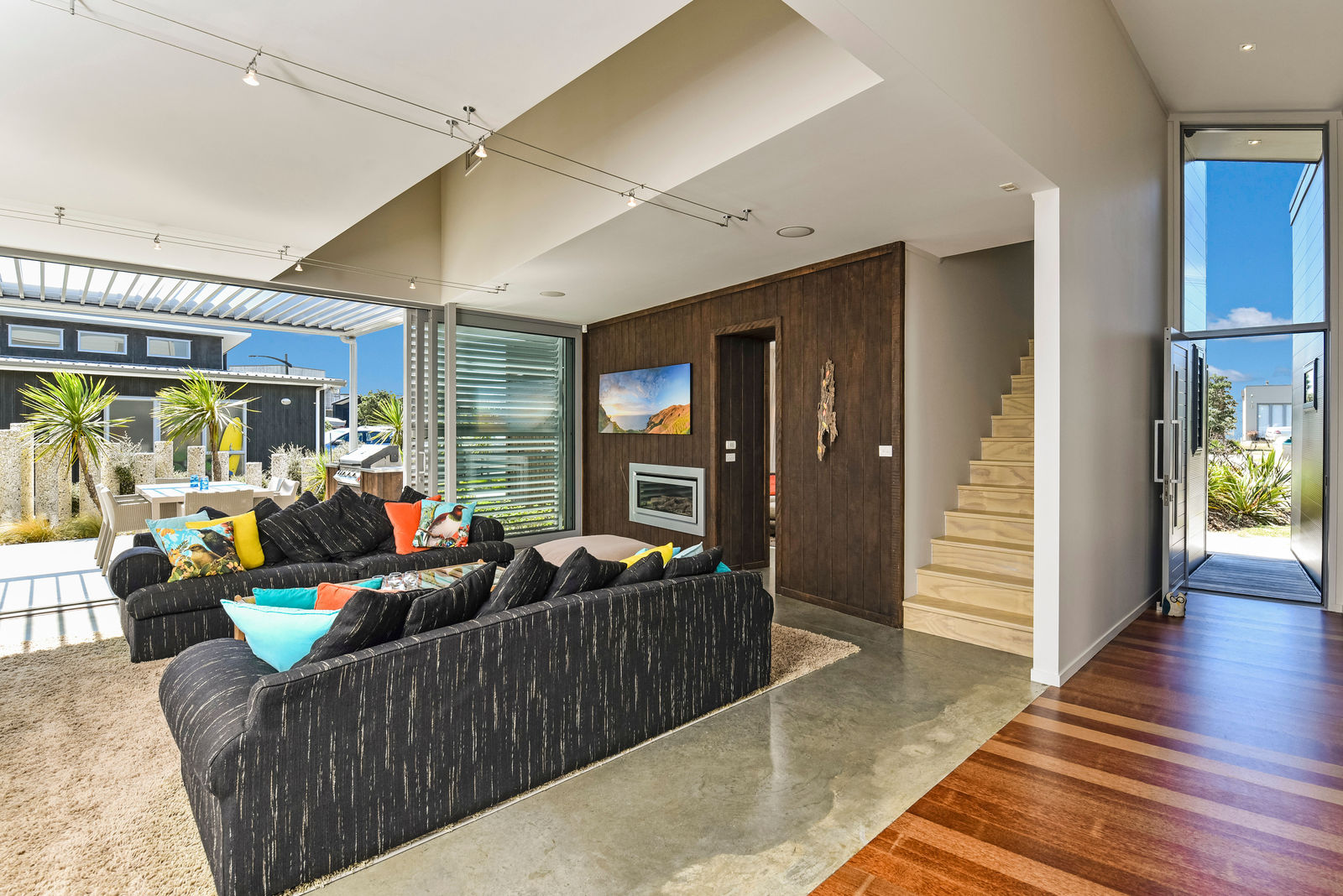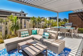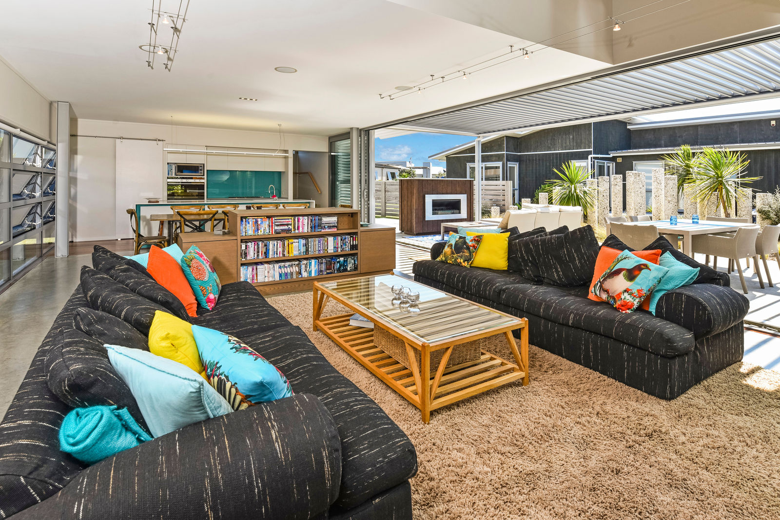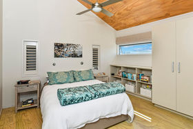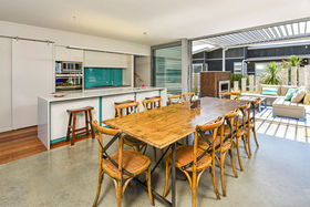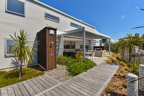 Built to reflect a boat shed, a quirky cool amazing interior surprises you with it's unexpected sophistication and stylish appointments for indoor/outdoor entertaining to make you feel you are truly at the beach. The exterior cladding is Nuwall powder coated aluminium, landscaping glamorous easycare, and interior features colour palettes of the sand and dunes. The flow of the house caters for separation of guests/family members from the master bedroom, and the open plan living areas can be screened off to suit different uses.