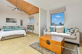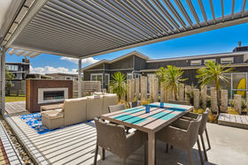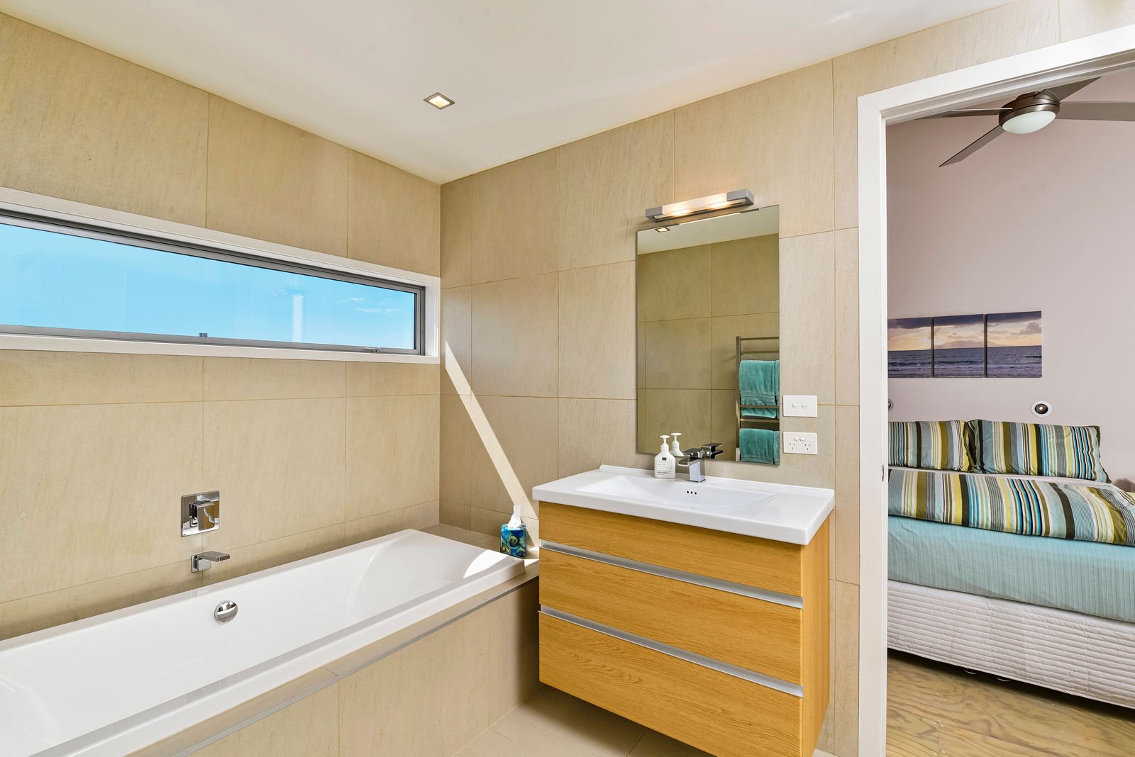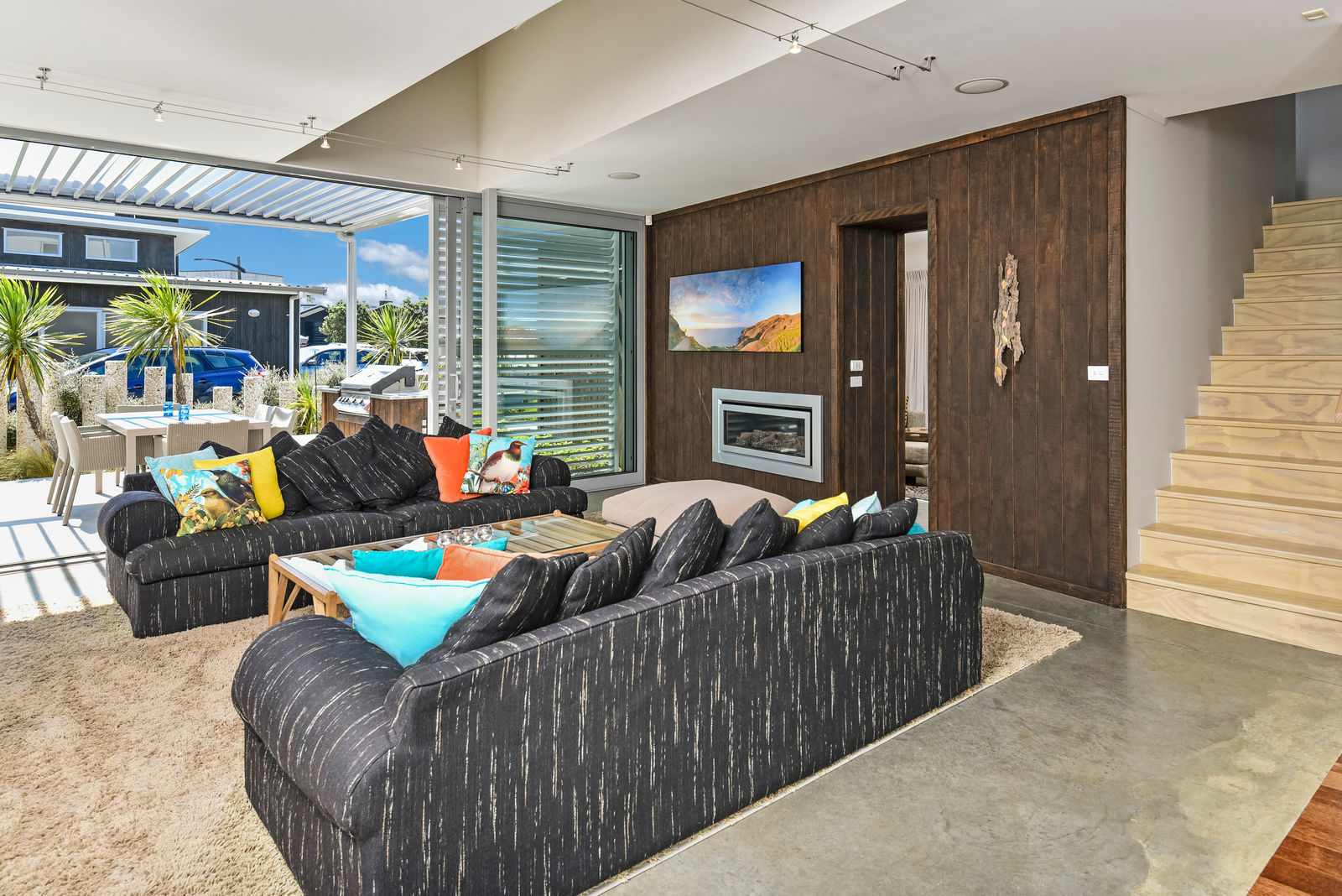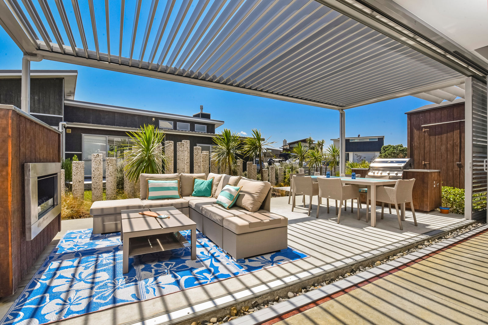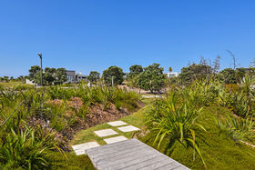 Built to reflect a boat shed, a quirky cool amazing interior surprises you with it's unexpected sophistication and stylish appointments for indoor/outdoor entertaining to make you feel you are truly at the beach. The exterior cladding is Nuwall powder coated aluminium, landscaping glamorous easycare, and interior features colour palettes of the sand and dunes. The flow of the house caters for separation of guests/family members from the master bedroom, and the open plan living areas can be screened off to suit different uses.