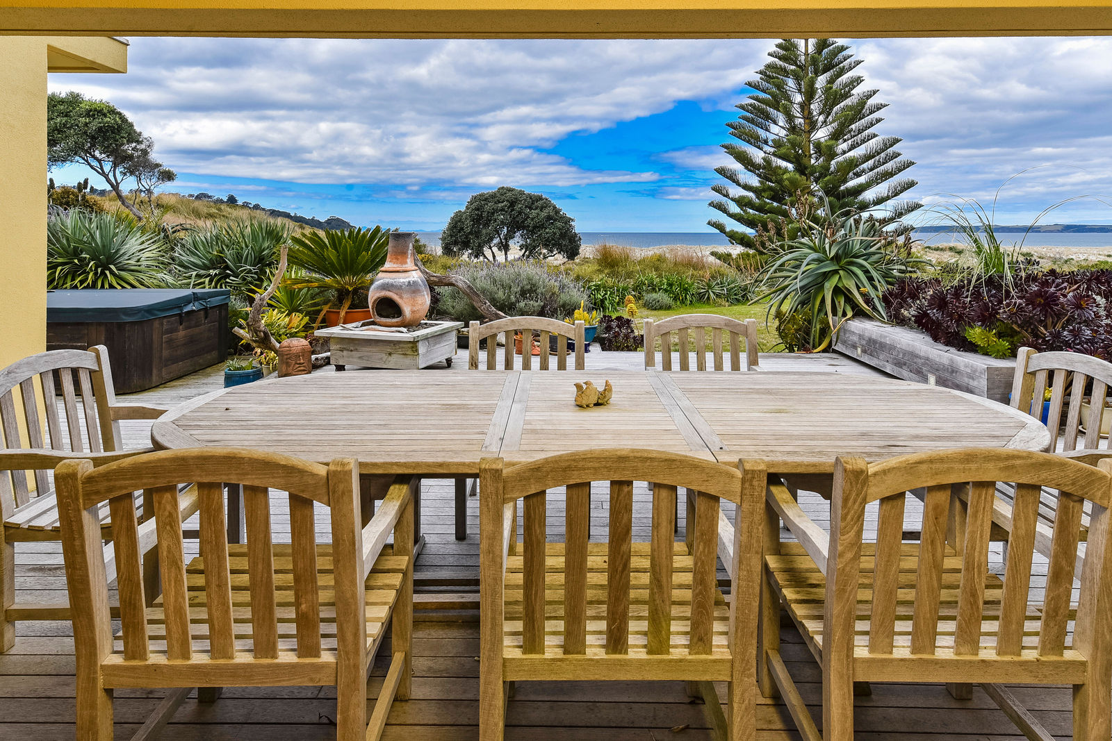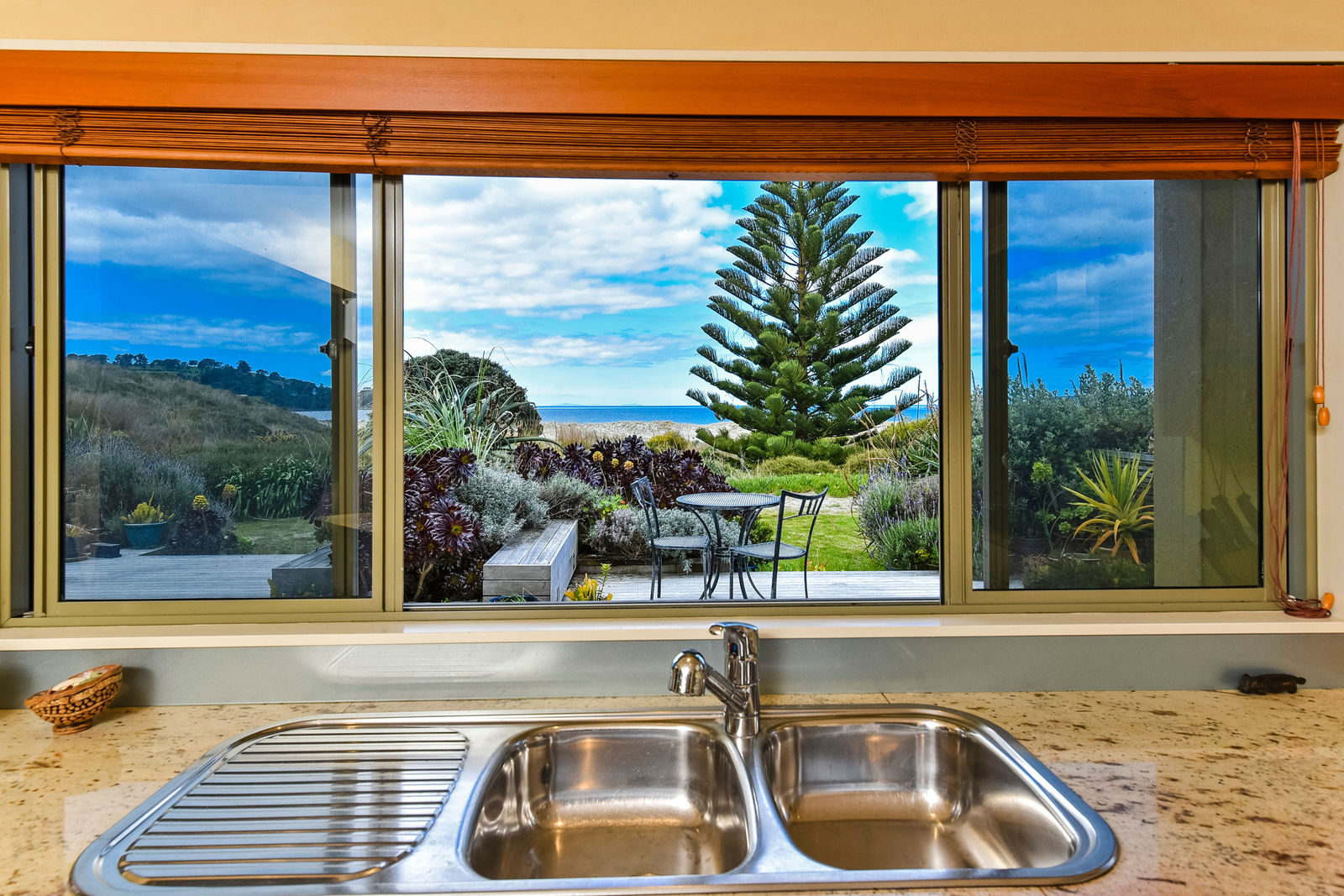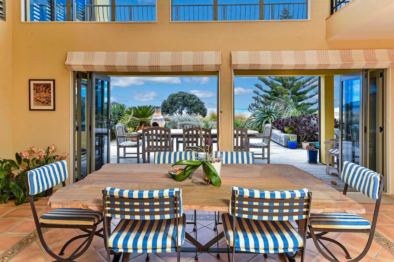 The exterior textured surfaces, detailed internal floor tiling are the hallmarks of Mediterranean décor. With the magnificent Omaha Beach as your back drop, back door, and the multiple indoor-outdoor living spaces this house is about enjoying life outside, and even on dark gloomy days the spicy touches warm up the cockles of your heart.