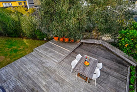 Open plan generous living /decks both sides/4 bedrooms/ensuite/1 full bathroom and separate garage with powder room with loft above.