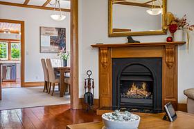 The formal front living room, anchored by a traditional fireplace, sets the tone: elegant, unhurried, and connected. Between this space and the rear of the home lies a refined dining room, the perfect bridge between heritage and modern living. The kitchen, reimagined in crisp white, is modern yet sympathetic, leading effortlessly to a relaxed family room and out to the covered deck and barbecue terrace. Here, manicured lawns, stone paths, and mature hedging form a series of outdoor rooms that feel as intentional as the interior design.
