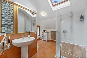 Upstairs, two dormered bedrooms rest beneath the roofline, each framed by skylights and subtle timber detail. The bathrooms are sanctuaries of texture and tone, with marble, terracotta, and soft neutrals combining to create warmth without excess. Every inch feels curated yet lived-in, a balance that few homes achieve.