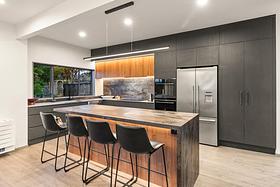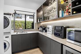 - Modern designer kitchen with a butlers pantry that neatly incorporates laundry facilities and opens outdoors