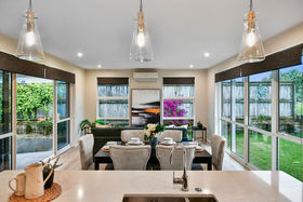 The kitchen is bright and practical, featuring gas cooking, a granite benchtop, a scullery with its own sink, and plenty of storage. The dining and living room are warm and inviting with a heat pump, and they open out to two separate spots to entertain. There's also a second lounge with a gas fireplace and built-in surround sound for movie nights or relaxing.